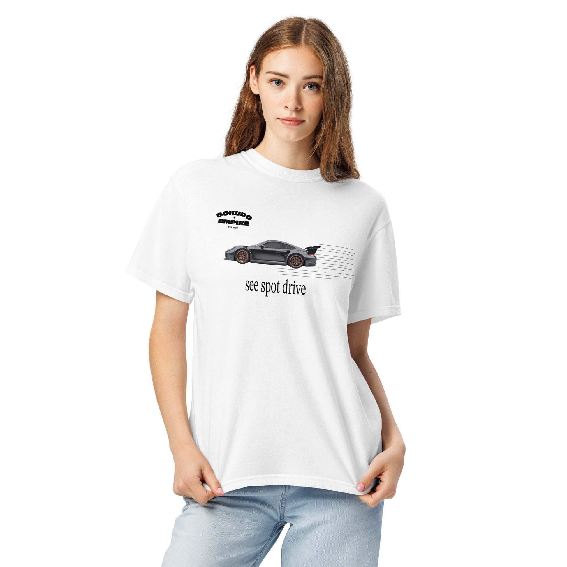 Hit the gas on style with the Sokudo Empire “See Spot Drive” Tee – a bold drop for those who live and breathe car culture. Featuring a clean side-profile graphic of a tuned-out Porsche with motion lines and our signature Sokudo branding, this tee captures the rush of the streets in motion. Crafted from heavyweight 100% garment-dyed cotton, it’s ultra-soft, breathable, and made to last – whether you’re cruising the highway or posted at a night meet.